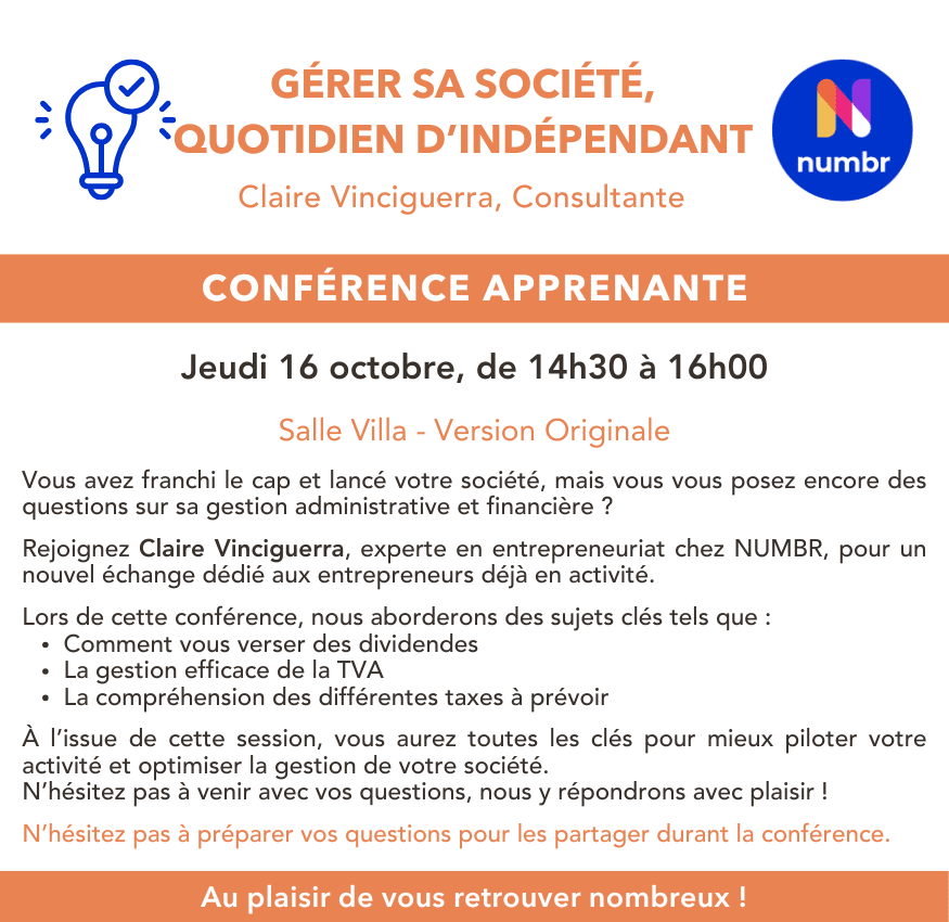 Nous vous recommandons d'avoir assister à la conférence "Créer sa société" au préalable. Il y a un replay disponible dans vos ressources.