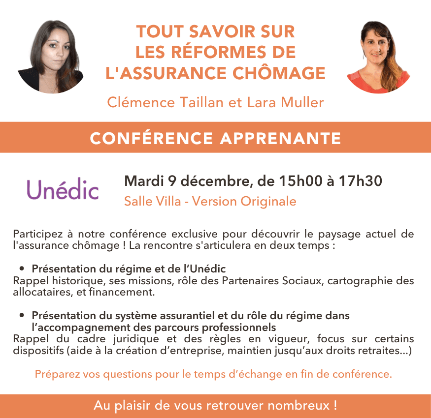 Clémence Taillan et Lara Muller, membres du CODIR de l'Unedic partageront avec vous les dernières réformes sur l'assurance chômage. Préparez vos questions pour les poser durant la conférence.